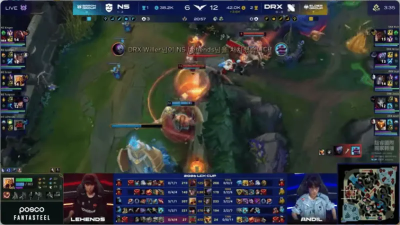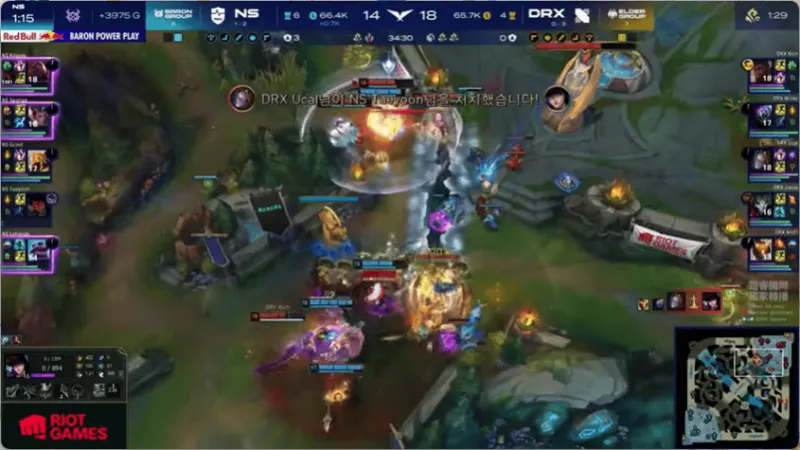 34分钟,DRX中路果断开团,击杀NS双C后打出0换4,随后DRX顺利一波