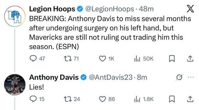 北京时间今日,NBA称,独行侠球星安东尼-戴维斯将接受左手韧带手术,大概率赛季报销,并且意味着浓眉的独行侠生涯已经结束。在消息发出后,浓眉第一时间更新个人社媒,他疑似驳斥了Shams的报道:“你们最好别再听信这些应用上的谣言了!”之后他还在相关的报道上回复:“谣言!”Shams表示,浓眉的左手韧带手术需要伤停数月,这意味着他本赛季大概率报销,而独行侠队方面则...
