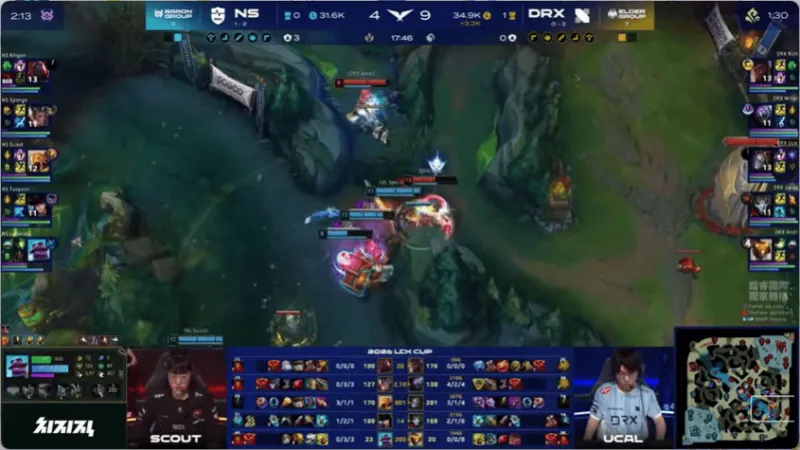 34分钟,DRX中路果断开团,击杀NS双C后打出0换4,随后DRX顺利一波